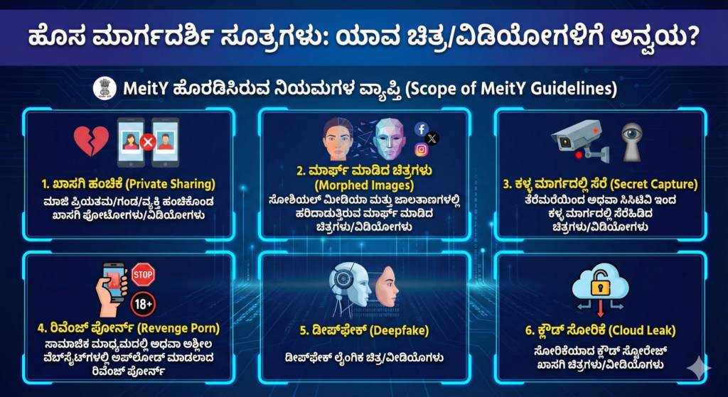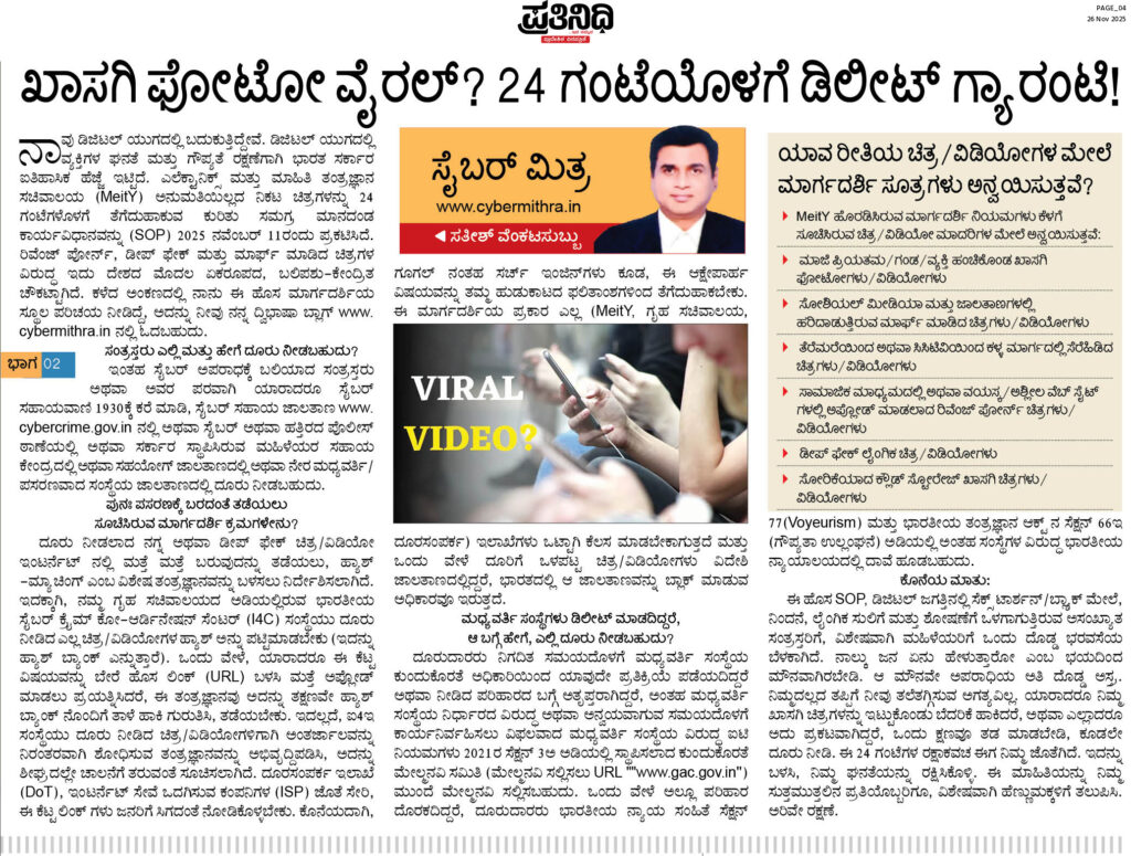 ಇದೇ ಅಸಹಾಯಕತೆಗೆ, ನೋವಿಗೆ ಈಗ ಕೇಂದ್ರ ಸರ್ಕಾರ ಒಂದು ಸ್ಪಷ್ಟವಾದ, ಬಲವಾದ ಪರಿಹಾರ ಮತ್ತು ಕಾಲಮಿತಿಯ ಉತ್ತರವನ್ನು ನೀಡಿದೆ. ಭಾರತದ “ಮಾಹಿತಿ ತಂತ್ರಜ್ಞಾನ (ಮಧ್ಯವರ್ತಿ ಮಾರ್ಗಸೂಚಿಗಳು ಮತ್ತು ಡಿಜಿಟಲ್ ಮಾಧ್ಯಮ ನೀತಿ ಸಂಹಿತೆ) ನಿಯಮಗಳು, 2021” ರಲ್ಲಿ ಇಂತಹ ಖಾಸಗಿ ಅಥವಾ ಡೀಪ್ಫೇಕ್ ಚಿತ್ರ/ವಿಡಿಯೋಗಳನ್ನು ಡಿಲೀಟ್ ಮಾಡಲು ಮತ್ತು ನಿಯಂತ್ರಿಸಲು ಮಧ್ಯವರ್ತಿ ಸಂಸ್ಥೆಗಳ (ಗೂಗಲ್, ಫೇಸ್ಬುಕ್ ಇತ್ಯಾದಿ) ಪಾತ್ರ ಮತ್ತು ಜವಾಬ್ದಾರಿಗಳ ಬಗ್ಗೆ ಉಲ್ಲೇಖವಿದೆ. ಇದೆ ನವೆಂಬರ್ 15 ರಂದು ಎಲೆಕ್ಟ್ರಾನಿಕ್ಸ್ ಮತ್ತು ಮಾಹಿತಿ ತಂತ್ರಜ್ಞಾನ ಸಚಿವಾಲಯ (MeitY) ಸಮಗ್ರ ಕಾರ್ಯಾಚರಣಾ ಕಾರ್ಯವಿಧಾನ (SOP) ವನ್ನು ಹೊರಡಿಸಿದ್ದು, ದೂರು ಬಂದ 24 ಗಂಟೆಗಳ ಒಳಗೆ ಆನ್ಲೈನ್ ಪ್ಲಾಟ್ಫಾರ್ಮ್ಗಳಿಂದ ಒಮ್ಮತವಿಲ್ಲದ ಖಾಸಗಿ ಚಿತ್ರಗಳನ್ನು ತ್ವರಿತವಾಗಿ ತೆಗೆದುಹಾಕುವುದನ್ನು ಕಡ್ಡಾಯಗೊಳಿಸುತ್ತದೆ ಮತ್ತು ಅದಕ್ಕೆ ಒಂದು ಮಾರ್ಗಸೂಚಿಯನ್ನು ಒದಗಿಸುತ್ತದೆ. ಈ ಉಪಕ್ರಮವು ಜುಲೈ 2025 ರಲ್ಲಿ ಮದ್ರಾಸ್ ಹೈಕೋರ್ಟ್ X v/s ಯೂನಿಯನ್ ಆಫ್ ಇಂಡಿಯಾ ಪ್ರಕರಣದಲ್ಲಿ ನೀಡಿದ ನಿರ್ದೇಶನದಿಂದ ಹುಟ್ಟಿಕೊಂಡಿದೆ, ಅಲ್ಲಿ ನ್ಯಾಯಮೂರ್ತಿ ಎನ್. ಆನಂದ್ ವೆಂಕಟೇಶ್ ಅವರು ಖಾಸಗಿ/ಒಮ್ಮತವಿಲ್ಲದ ಚಿತ್ರಗಳ ಪ್ರಸರಣವನ್ನು ತಡೆಯಲು/ಡಿಲೀಟ್ ಮಾಡಲು ನಿರ್ದೇಶನವನ್ನು ರೂಪಿಸಲು MeitY ಗೆ ಆದೇಶಿಸಿದರು.