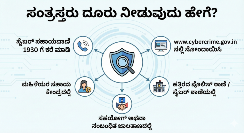 ಇಂತಹ ಸೈಬರ್ ಅಪರಾಧಕ್ಕೆ ಬಲಿಯಾದ ಸಂತ್ರಸ್ಥರು ಅಥವಾ ಅವರ ಪರವಾಗಿ ಯಾರಾದರು ಸೈಬರ್ ಸಹಾಯವಾಣಿ 1930 ಗೆ ಕರೆ ಮಾಡಿ, ಸೈಬರ್ ಸಹಾಯ ಜಾಲತಾಣ www.cybercrime.gov.in ನಲ್ಲಿ ಅಥವಾ ಸೈಬರ್ ಅಥವಾ ನಿಮ್ಮ ಹತ್ತಿರದ ಪೊಲೀಸ್ ಠಾಣೆಯಲ್ಲಿ ಅಥವಾ ಸರಕಾರ ಸ್ಥಾಪಿಸಿರುವ ಮಹಿಳೆಯರ ಸಹಾಯ ಕೇಂದ್ರದಲ್ಲಿ ಅಥವಾ ಸಹಯೋಗ್ ಜಾಲತಾಣದಲ್ಲಿ ಅಥವಾ ನೇರ ಮಧ್ಯವರ್ತಿ/ಪಸರವಾದ ಸಂಸ್ಥೆಯ ಜಾಲತಾಣದಲ್ಲಿ ದೂರು ನೀಡಬಹುದು.